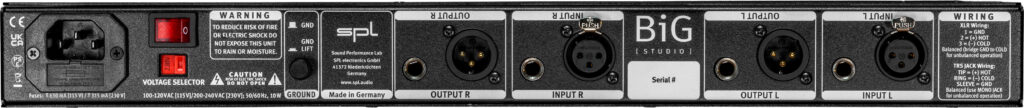 All inputs and outputs of the BiG [Studio] are equipped with XLR jacks with gold-plated contacts and TRS jacks. The XLR and TRS jacks are connected in parallel. Signal transmission is electronically balanced at a nominal level of 6 +dB.